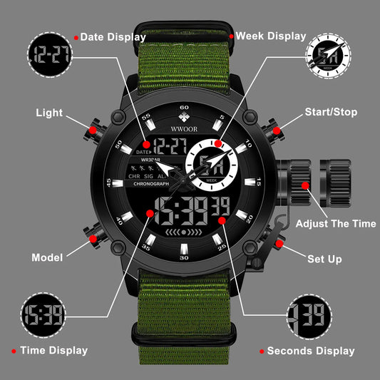 Tactical Military Sports Men's Digital Quartz Nylon Watch | Waterproof Dual Display